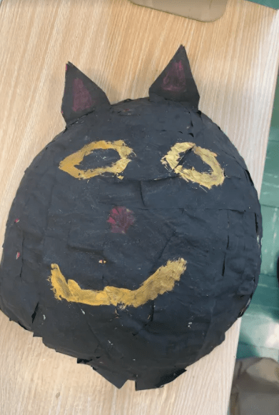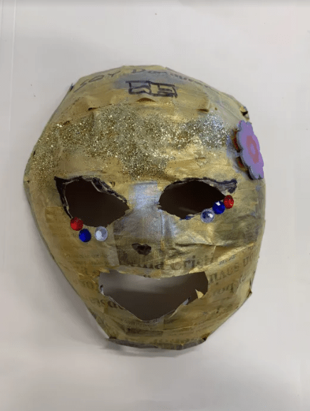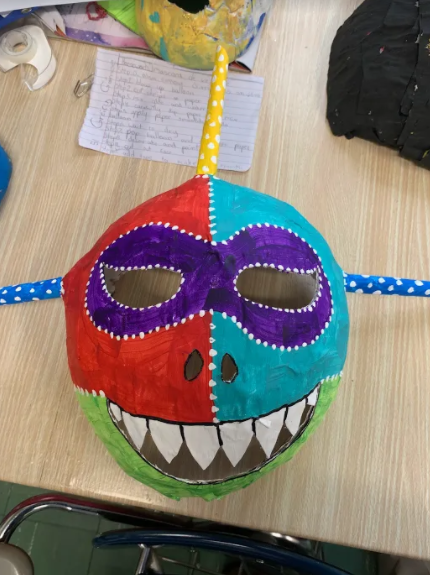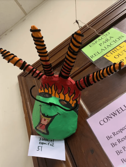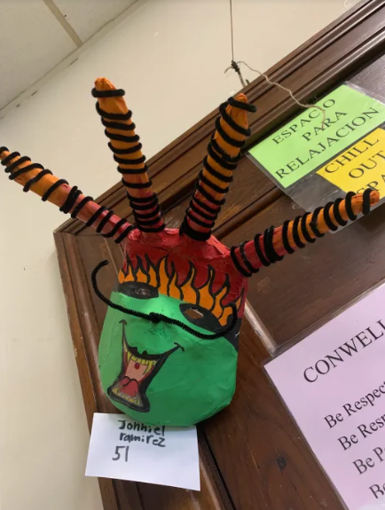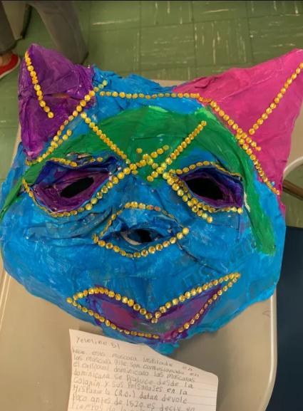 G. Gomez of section 51, has made a mask for Ms. DeJesus’s class. And it was a lot of hard work, but she said she didn’t mind. Other students made this festive mask, and here is what G. Gomez has to say: