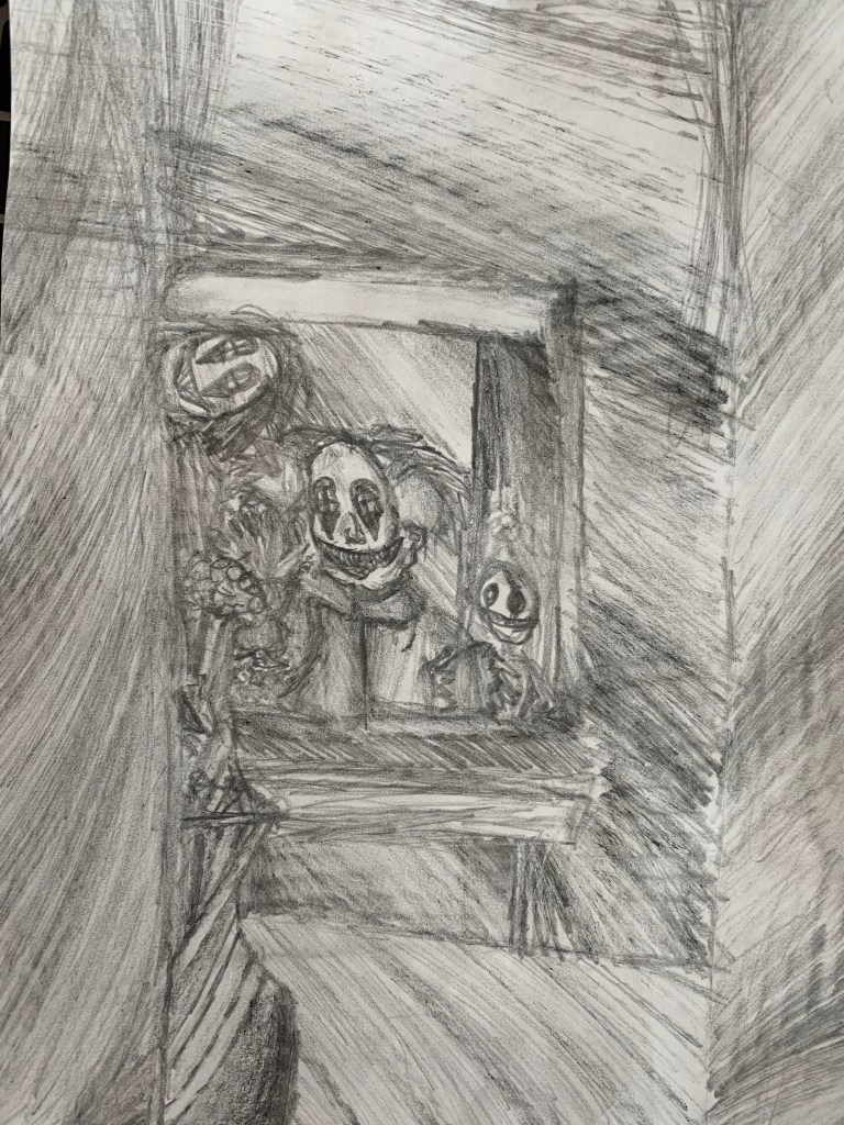 I was In the bathroom, and I thought I was safe, but I really wasn’t safe. There was a little window in the bathroom. When I looked at the small window I saw the clowns!