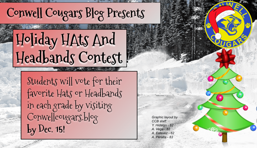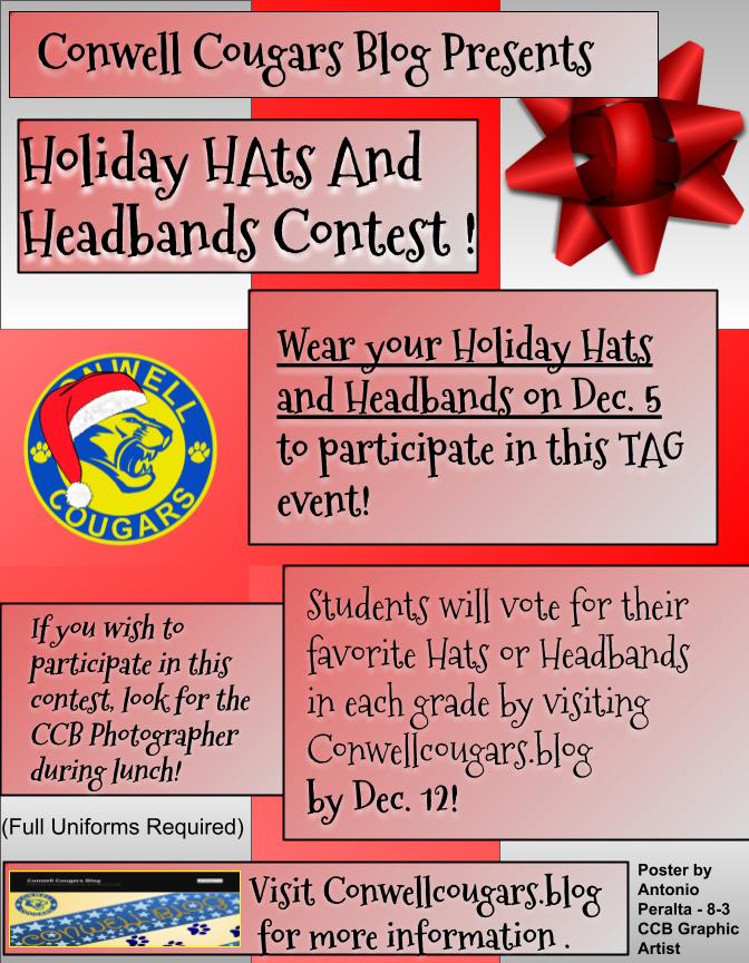 Conwell Cougars Blog presents a contest around the Dec. 5 Holiday Headbands and Hats Tag Day. Students who wear their hats or headbands will have their chance to be photographed during their lunch times.