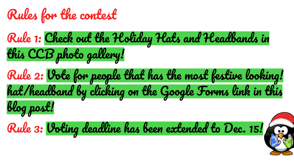 I am so happy to say, that we are back with the Christmas hat contest Winners! This whole contest is credited to Y. Hidalgo, among the other great CCB editors, who came up with this Idea! Now, let’s continue!