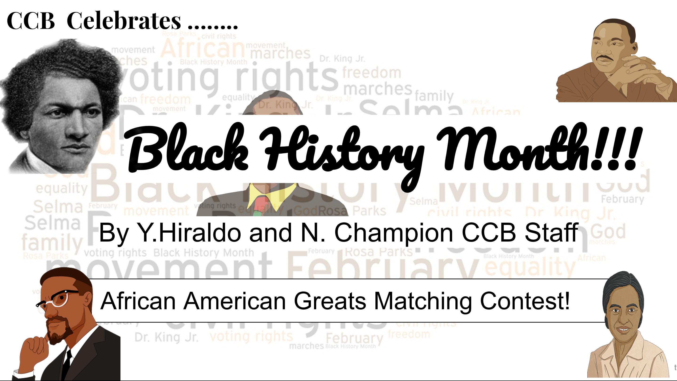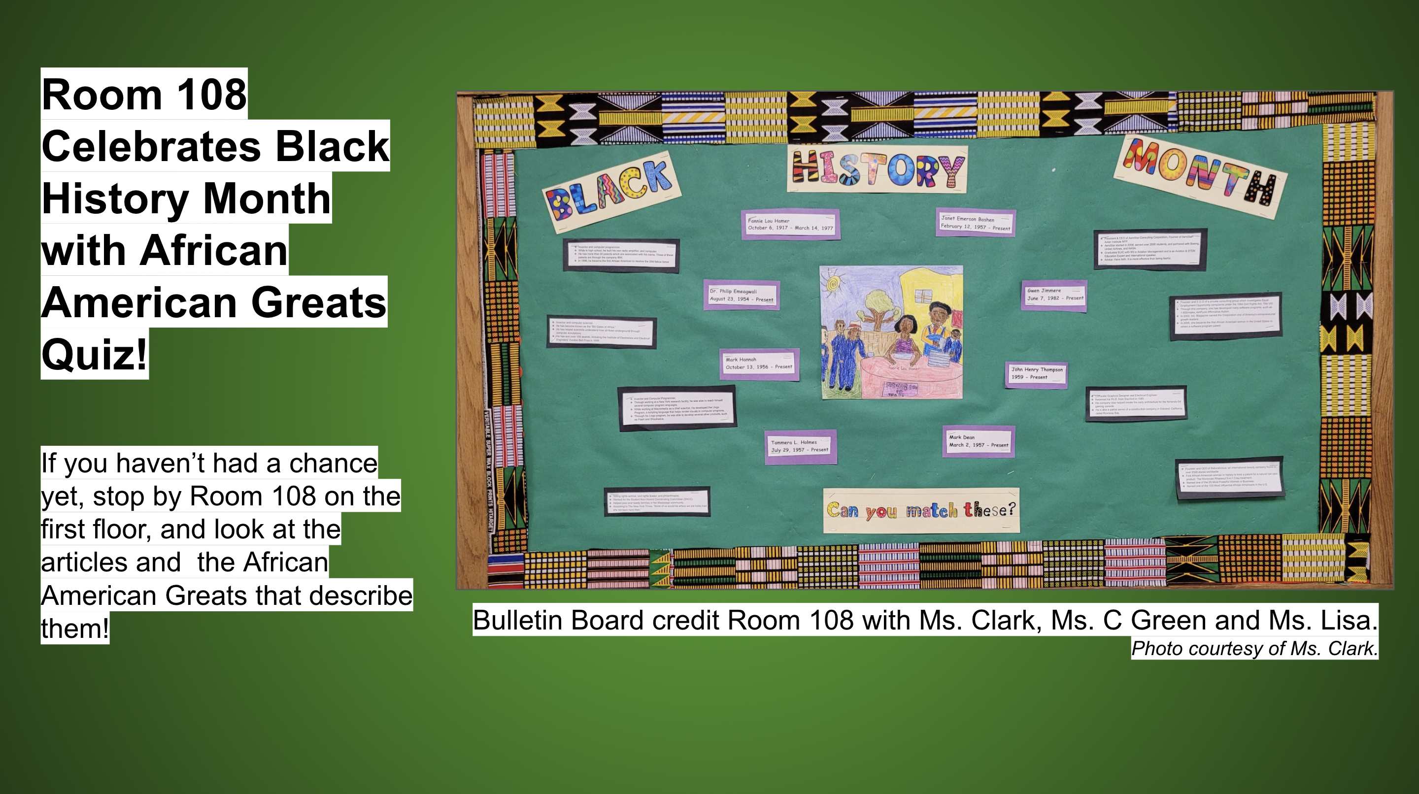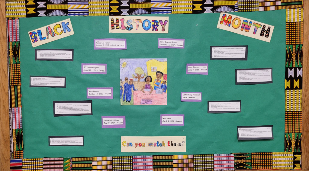 The Conwell Cougars Blog will be holding another contest in honor of Black History Month, and we’re focusing it around the amazing bulletin board outside of Room 108, titled “Black History Month, Celebrating African American Greats” where students can match impressive historic facts with the correct African American figures.