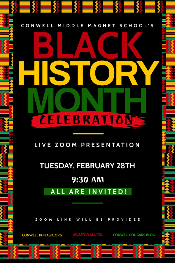 Conwell Middle Magnet School hosted a live Zoom event on Feb. 28 in celebration of Black History Month. The event included five Conwell Cougars.Blog produced interviews by Conwell students and staff about their African heritage.